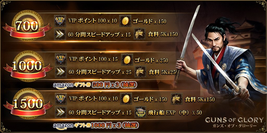 Guns Of Glory ガンズ オブ グローリー On Twitter フォロワー拡大キャンペーン始動 目標達成ごとに 全員へリワードをプレゼント 1000人達成からは 抽選で Amazonギフト券 も 応募方法 1 Gog Japan をフォロー 2 本ツイートをrt 3 コメントに王国